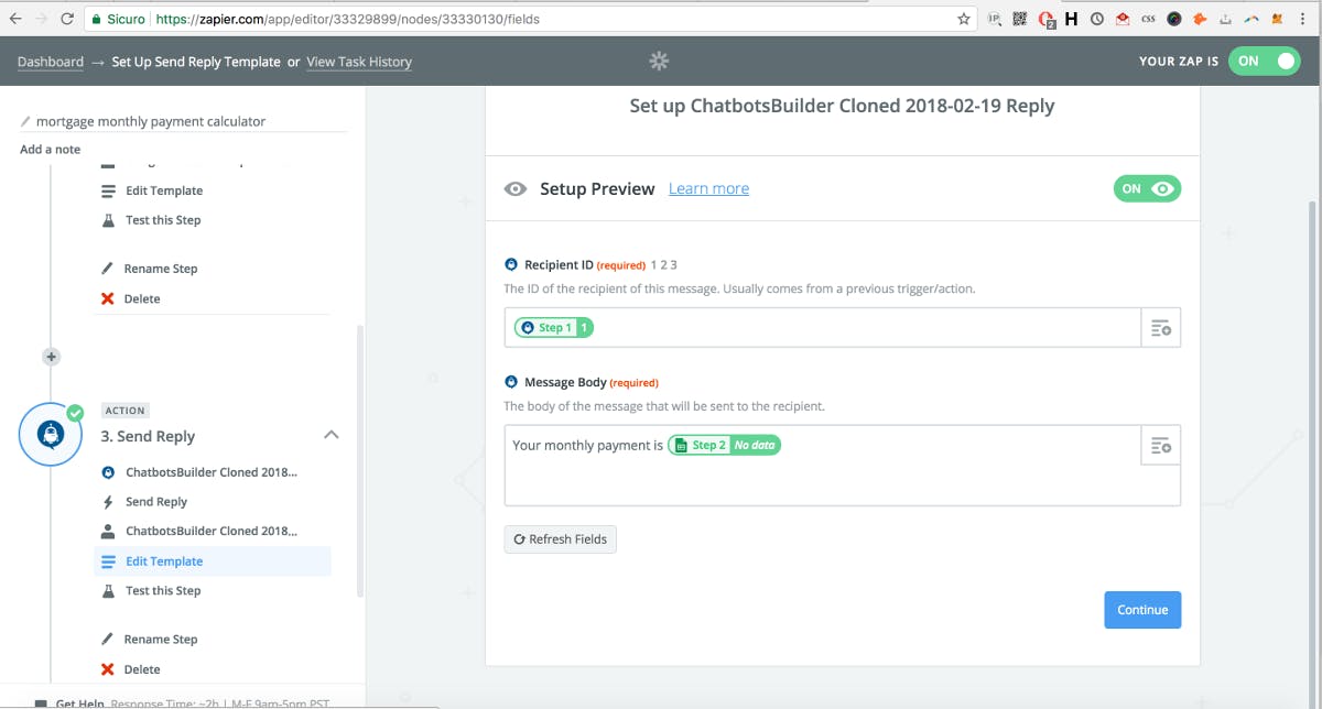 The last step to do is send back the calculated amount to the user - and we can do this by using again the ChatbotsBuilder integration but this time as an action, not as a trigger. So basically we will tell Zapier: take the number you calculated in the previous step, compose a message with it (something like “Your monthly payment is {{amount}}”) and send it to the user that originally sent us the message.
