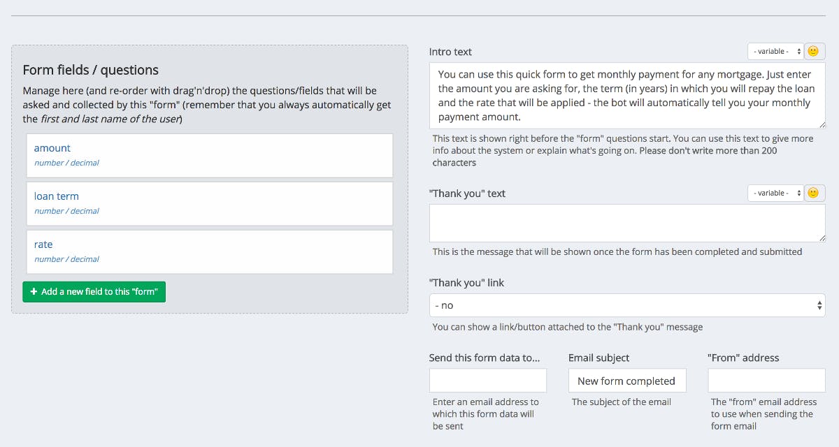 The first thing you need to do is create the “form” in your chatbot. You want to ask users the mortgage amount, the number of years in which the mortgage will be paid and the interest rate.
