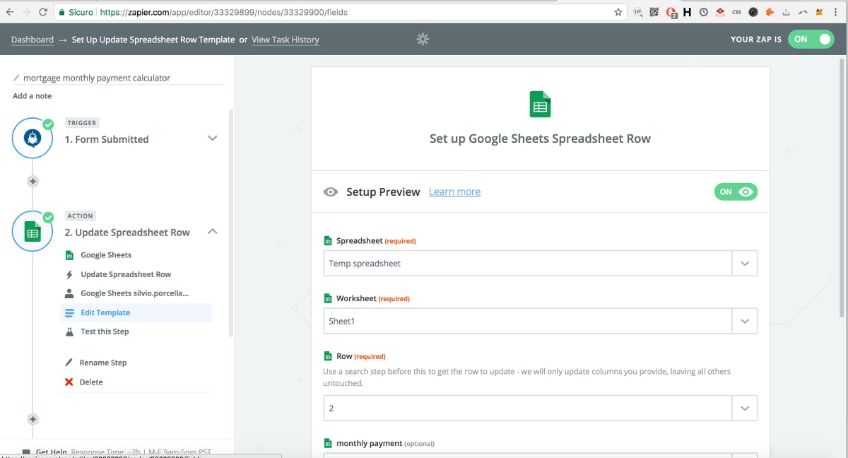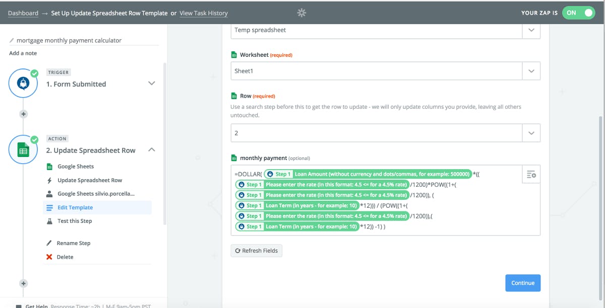 Now let’s add the “action” for this “trigger”. We want to use Google Sheets so we select that integration. Here comes the magic: as you can read on this Zapier doc, when you integrate with Google Sheets you can enter a formula in a column, directly on Zapier - this is where we will enter the equation used for calculating the monthly payment (click here for the formula).